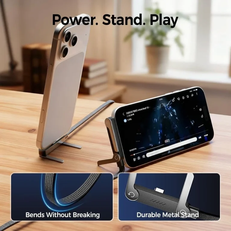 My desk used to be full of cables. This flat cable and built-in stand keeps my space clean. I can charge, watch YouTube, and scroll without fighting wires.